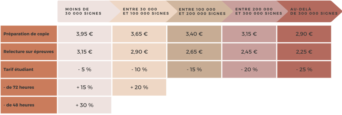 Le barème suivant servira de point de départ pour l'établissement du devis. Les tarifs sont indicatifs, pour une base de 1500 signes, et pourront être amenés à évoluer si d'autres critères sont à prendre en compte.