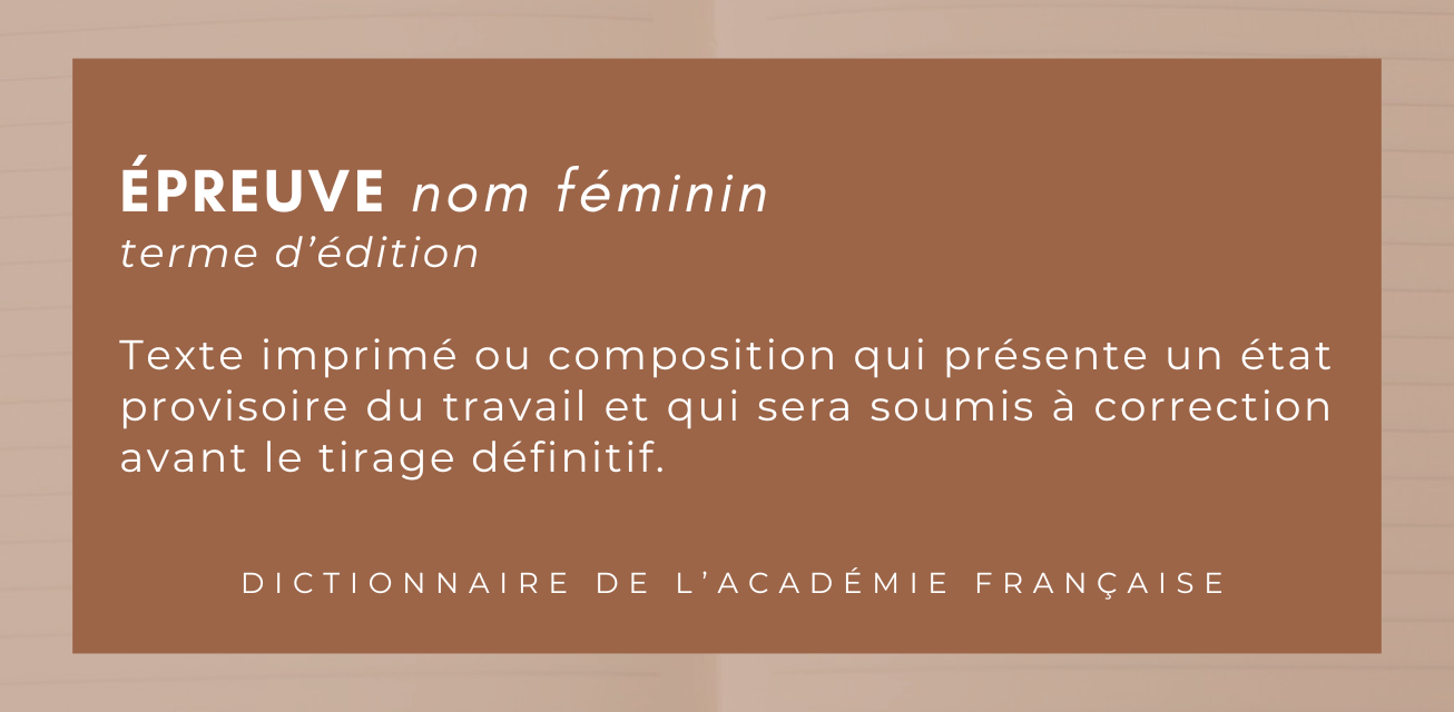 Une épreuve correspond à la forme quasi définitive du document. Celui-ci a déjà fait l’objet d’une relecture et d'une correction, dans le cadre de la préparation de copie : le fond a été retravaillé à partir des remarques formulées par le relecteur, et le texte a été mis en page.
